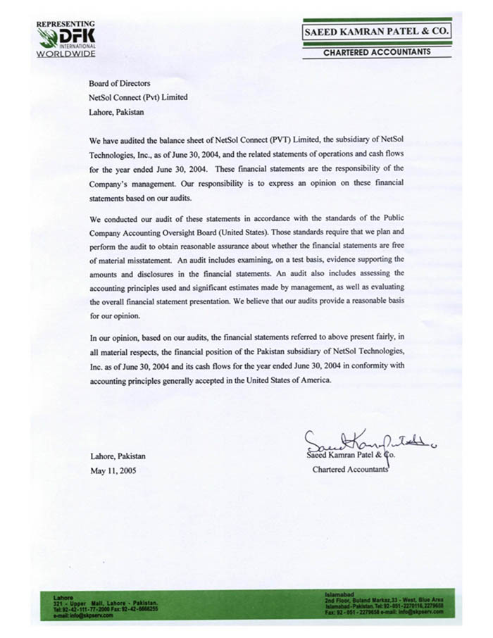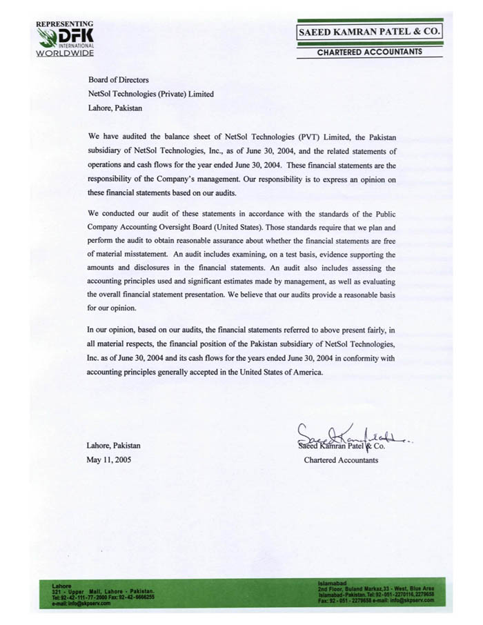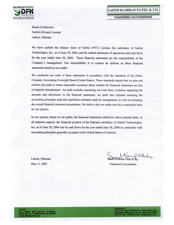 incorporated by reference as Exhibit 99.1 to NetSol’s Current Report filed