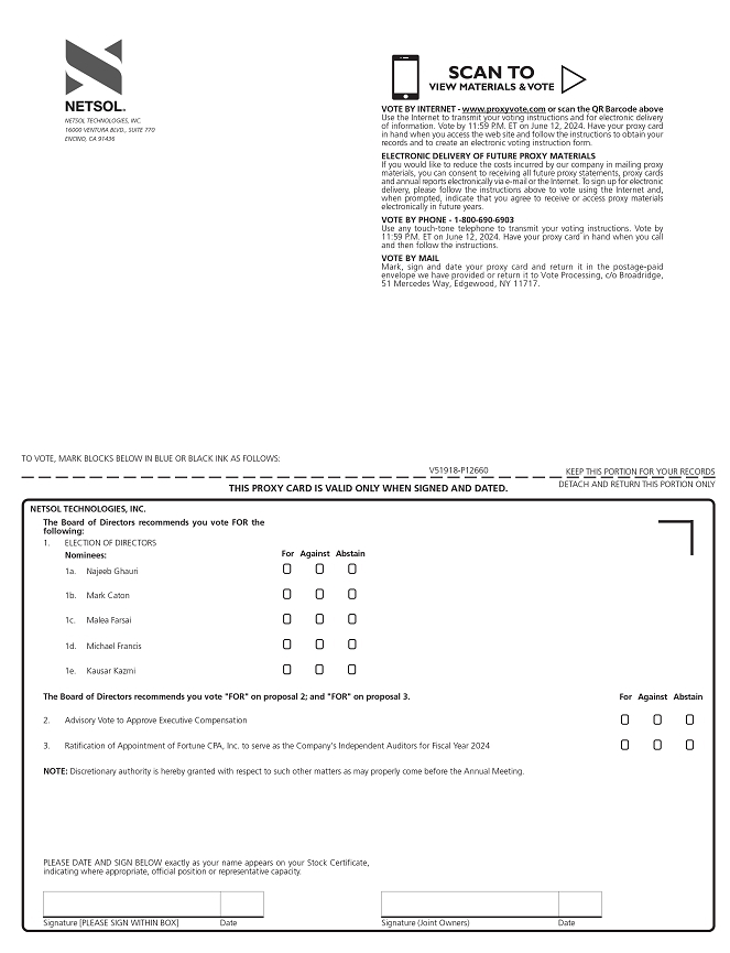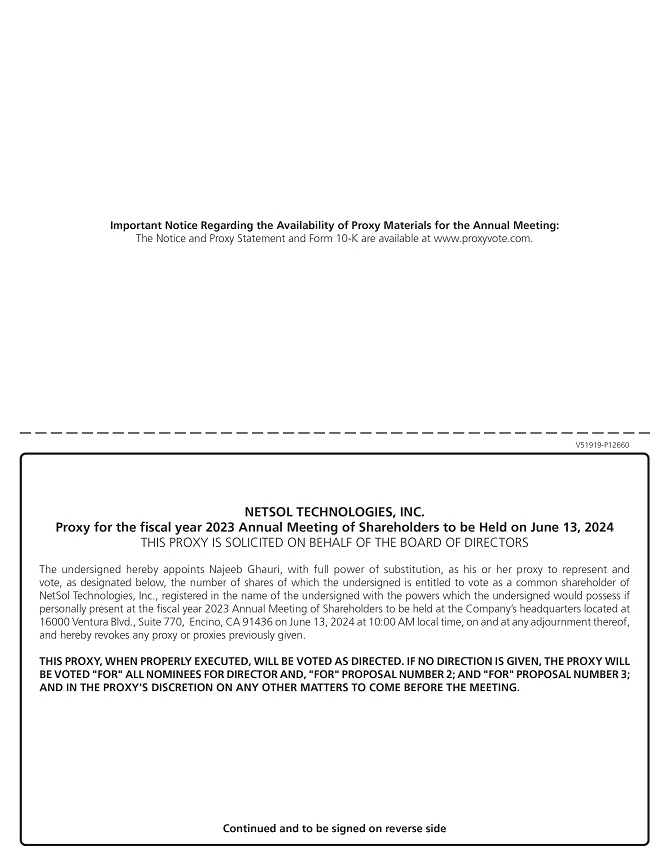 Important Notice Regarding the Availability of Proxy Materials for the Annual Meeting of Shareholders to be held on June 13, 2024. This Notice of the 2023 Annual Meeting of Shareholders and Proxy Statement, are available free of charge at www.proxyvote.com or at www.netsoltech.com/proxy. References in either document to our website are for the convenience of readers, and information available at or through our website is not part of, nor is it incorporated by reference in, the Proxy Statement.
