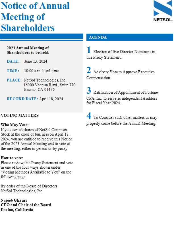 The Board of Directors of NetSol Technologies, Inc. is soliciting proxies to be voted at our 2023 Annual Meeting of Shareholders on June 13, 2024, and at any postponed or reconvened meeting. We expect that the proxy materials or a notice of internet availability will be mailed and made available to shareholders beginning on or about May 13, 2024. At the meeting, votes will be taken on the matters listed in the Notice of 2023 Annual Meeting of Shareholders.