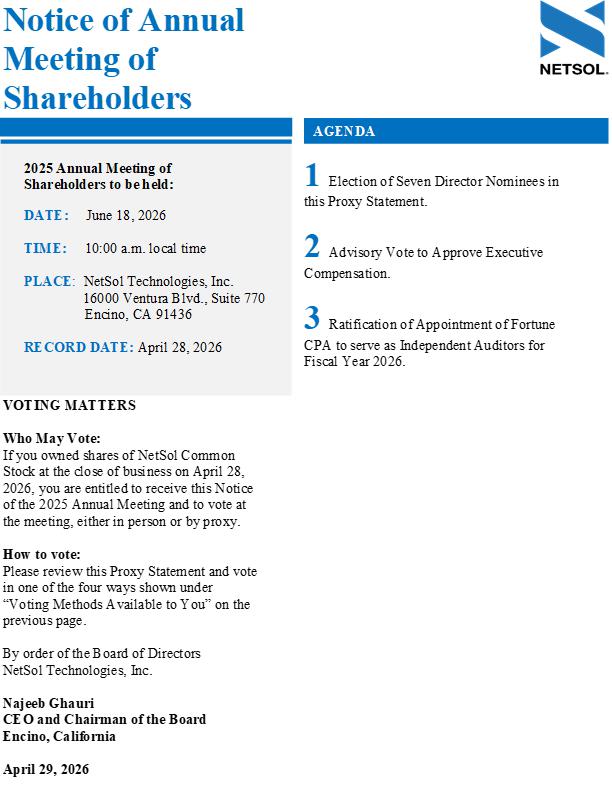 The Board of Directors of NetSol Technologies, Inc. is soliciting proxies to be voted at our 2025 Annual Meeting of Shareholders on June 18, 2026, and at any postponed or reconvened meeting. We expect that the proxy materials or a notice of internet availability will be mailed and made available to shareholders beginning on or about May 1, 2026. At the meeting, votes will be taken on the matters listed in the Notice of the 2025 Annual Meeting of Shareholders.